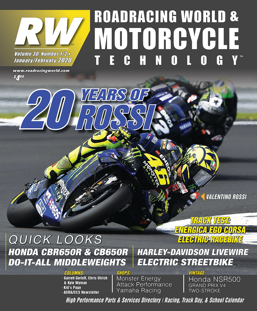 January / February 2020 Issue: Featuring 20 Years of Rossi!, Inside Info: Aprilia Misano Tuono 1100 and RSV 1000, Quick Look: Honda CBR650/650R, Quick Look: Harley-Davidson LiveWire Electric Streetbike, Army of Darkness 2019, and SHOPS Attack Performance. BUY NOW