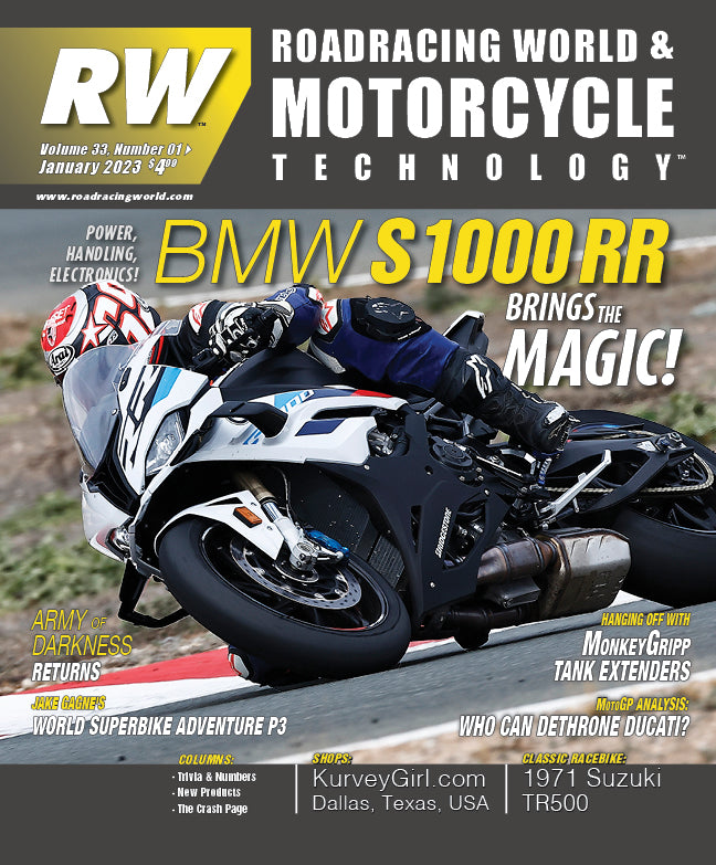 WorldSBK Testing In Spain; Historic Racebike Illustrations: 1971 Suzuki TR500; Intro: 2023 BMW S 1000 RR & M 1000 R—Best Electronics Ever! MotoGP Analysis : Who Can Dethrone Ducati In 2023, And How? Interview: MonkeyGripp Tank Extenders Inventor Nick Kaplan Shops: KurveyGirl.com, Sells Stuff That’s Hard To Find, And Ships It Fast; Army Of Darkness: The Racing River Flows On In 2022, Part One; World Superbike: Gagne & Attack vs. The World! Part Three; Letters To The Editor: Defining “Assembly Line” ; 10 Years Ago: Casey Stoner & Dani Pedrosa Win Races But Jorge Lorenzo Wins Second MotoGP World Championship; Mat Oxley Looks at Riding Styles; Shops Visits K-Tech Suspension; Jeremy Toye Develops A ZX-10R Racebike; And More...Number & Trivia: Jake Gagne's Career; Kids' Page: Stanley Gustafson; The Crash Page: Marc Marquez At The 2022 MotoGP Finale At Valencia; New Products: Racing Parts For The Yamaha YZF-R7; Chris Ulrich: Adventures Of An Ex-Racer: Saying Goodbye to Auto Club Speedway BUY NOW
